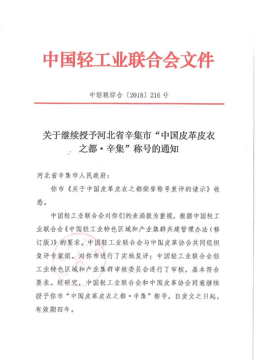 关于继续授予河北省辛集市“中国皮革皮衣之都•辛集”称号的通知
