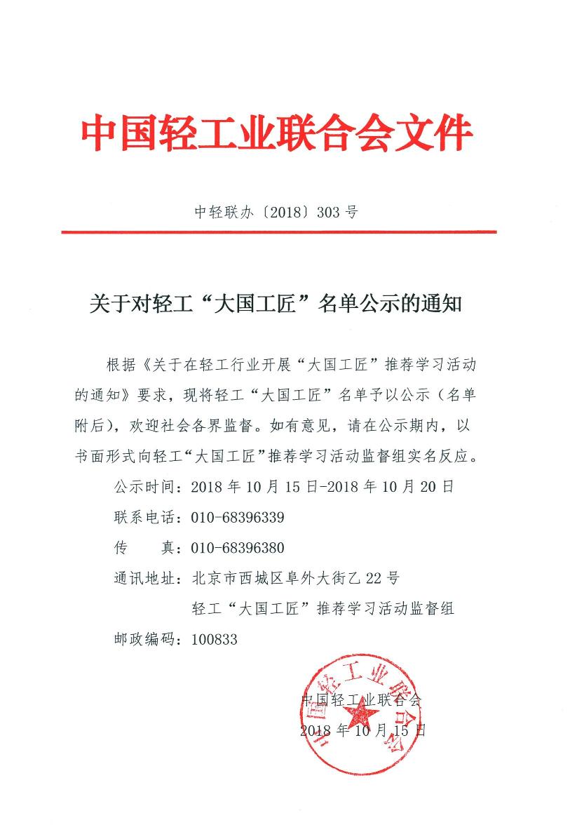 关于对轻工“大国工匠”名单公示的通知