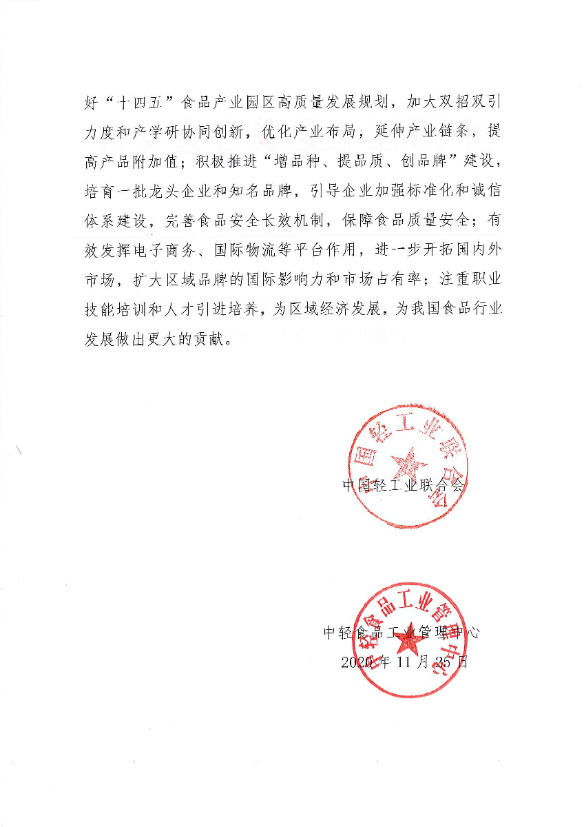 关于授予山东省济宁市金乡县“中国特色食品产业聚集区·金乡”称号的通知