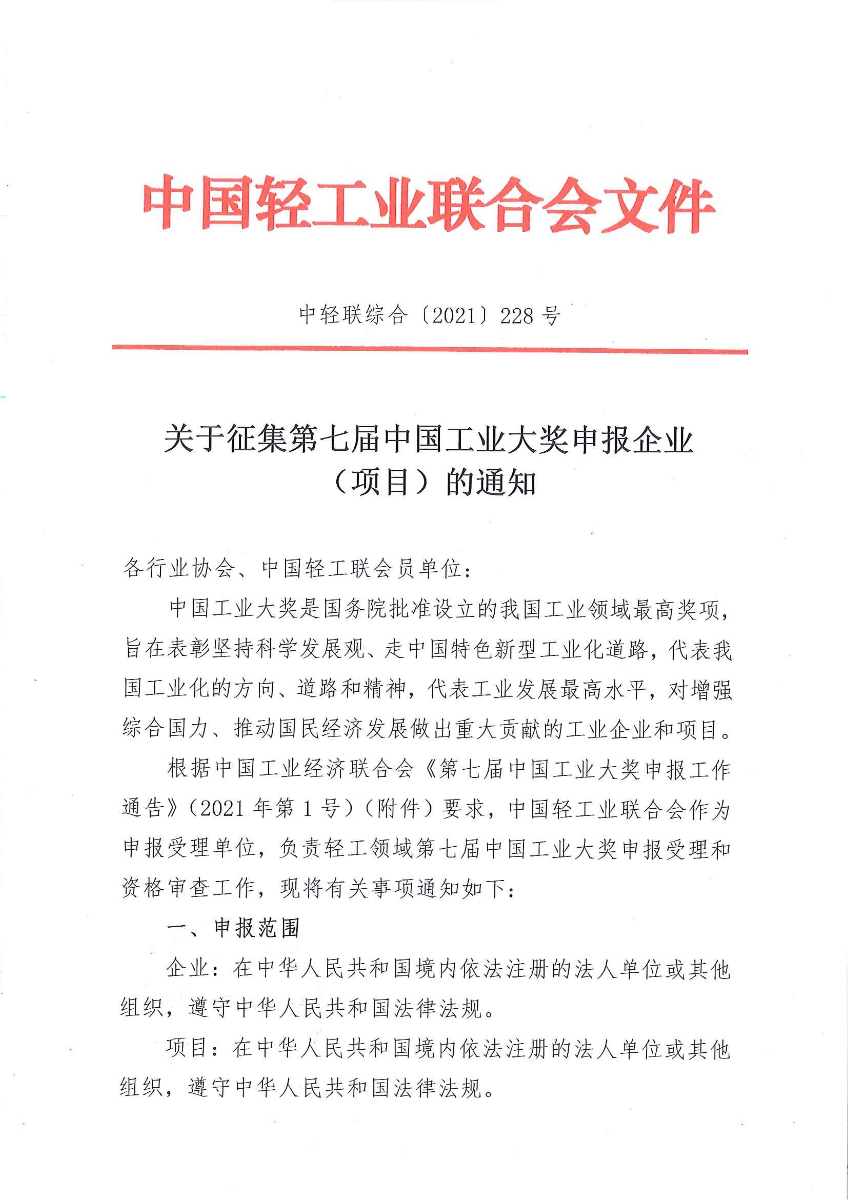 关于征集第七届中国工业大奖申报企业 (项目)的通知