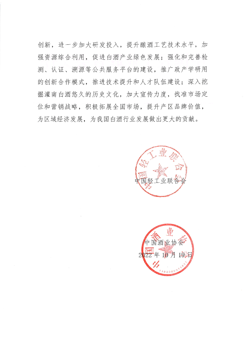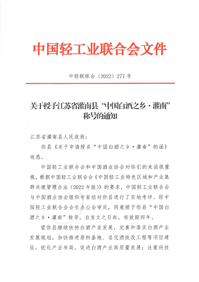 关于授予江苏省灌南县“中国白酒之乡·灌南”称号的通知