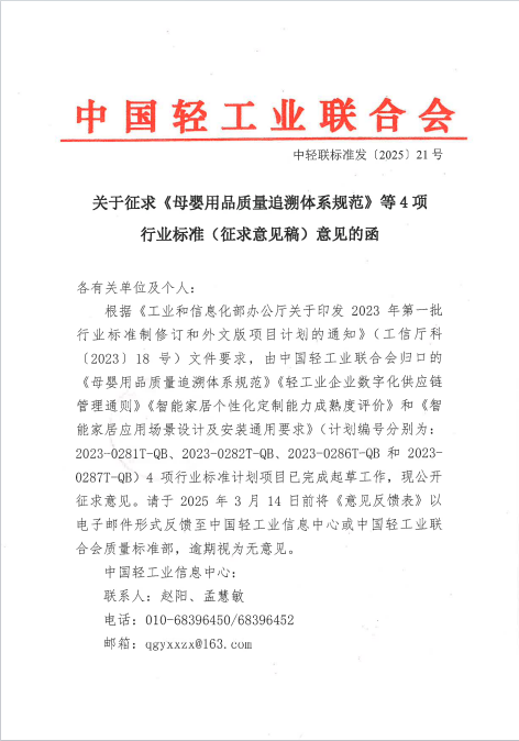 关于征求《母婴用品质量追溯体系规范》等4项行业标准(征求意见稿)意见的函