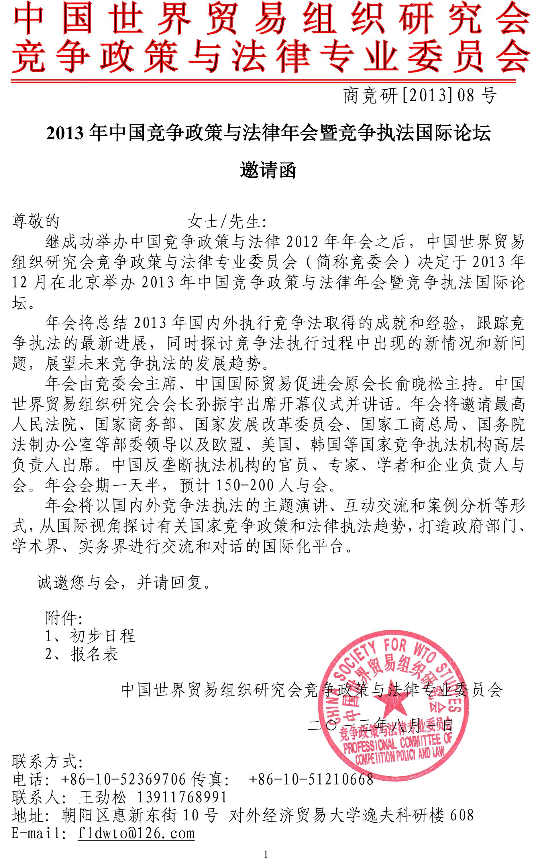 附件1 中国竞争政策与法律2013年年会 暨竞争执法国际论坛 初步日程 日期:2013年12月12日-13日 地点:北京 第一天(12月12日) 上午9:30-12:00 开幕仪式与主题演讲 主持人:中国世贸组织研究会竞争政策与法律专业委员主席、中国贸促会前会长俞晓松 致 辞:中国世贸组织研究会会长、中国驻WTO首任大使孙振宇 中国监管部门代表 外国监管部门代表(包括美国、欧盟和韩国) 中午12:00-13:30 午餐 下午13:30-15:15 经营者集中审查(一) 本场将会讨论关于经营者集中审查实践的若干议题,包括“控制”的定义和营业额的计算,以决定是否会触发经营者集中的申报,经营者集中审查与国家安全审查之间的关系,在申报过程中如何使用经济学分析和收集数据,经营者集中审查程序中VIE结构将被如何看待等等。 下午15:15-15:30 茶歇 下午15:30-17:00 经营者集中审查(二) 本场将会讨论关于经营者集中审查实践的其他一些议题,包括对涉及横向兼并、纵向兼并和设立合资公司的经营者集中申报的不同审查视角,以及附加限制性条件的救济方式协商与实践等等。 下午17:00-18:30 鸡尾酒会 第二天(12月13日) 上午8:30-10:00 限制竞争行为 本场将会回顾过去一年在限制竞争行为领域最典型的案例,包括由中国国家发改委、中国国家工商行政管理总局和其他外国监管部门实施的案例,以及在中国的反垄断法私人执行制度,然后进行分析和比较。 上午10:00-10:15 茶歇 上午10:15-10:45 集团内部协议/合资协议 绝大多数在中国开展业务的跨国公司对这个特定议题有兴趣。他们总是很疑惑在中国反垄断法框架下应该如何处理集团内部协议或者合资协议,中国在这些领域有没有任何已经确立的规则,以及各市场主体应当遵循何种指引在中国行事。 上午10:45-11:30 滥用市场支配地位 本场将回顾和分析过去一年在滥用市场支配地位领域最典型的案例。此外,监管部门将会介绍这个领域未来执法的趋势。 上午11:30-11:45 茶歇 上午11:45-12:30 反垄断法与知识产权 本场将评论国家工商总局起草并征求意见的最新一稿《工商行政管理机关禁止滥用知识产权排除、限制竞争行为的规定》草案,评论并分析在中国以及其他辖区最新的案例。 闭幕 午餐 附件2 2013年中国竞争政策与法律年会暨竞争执法国际论坛 参会报名表