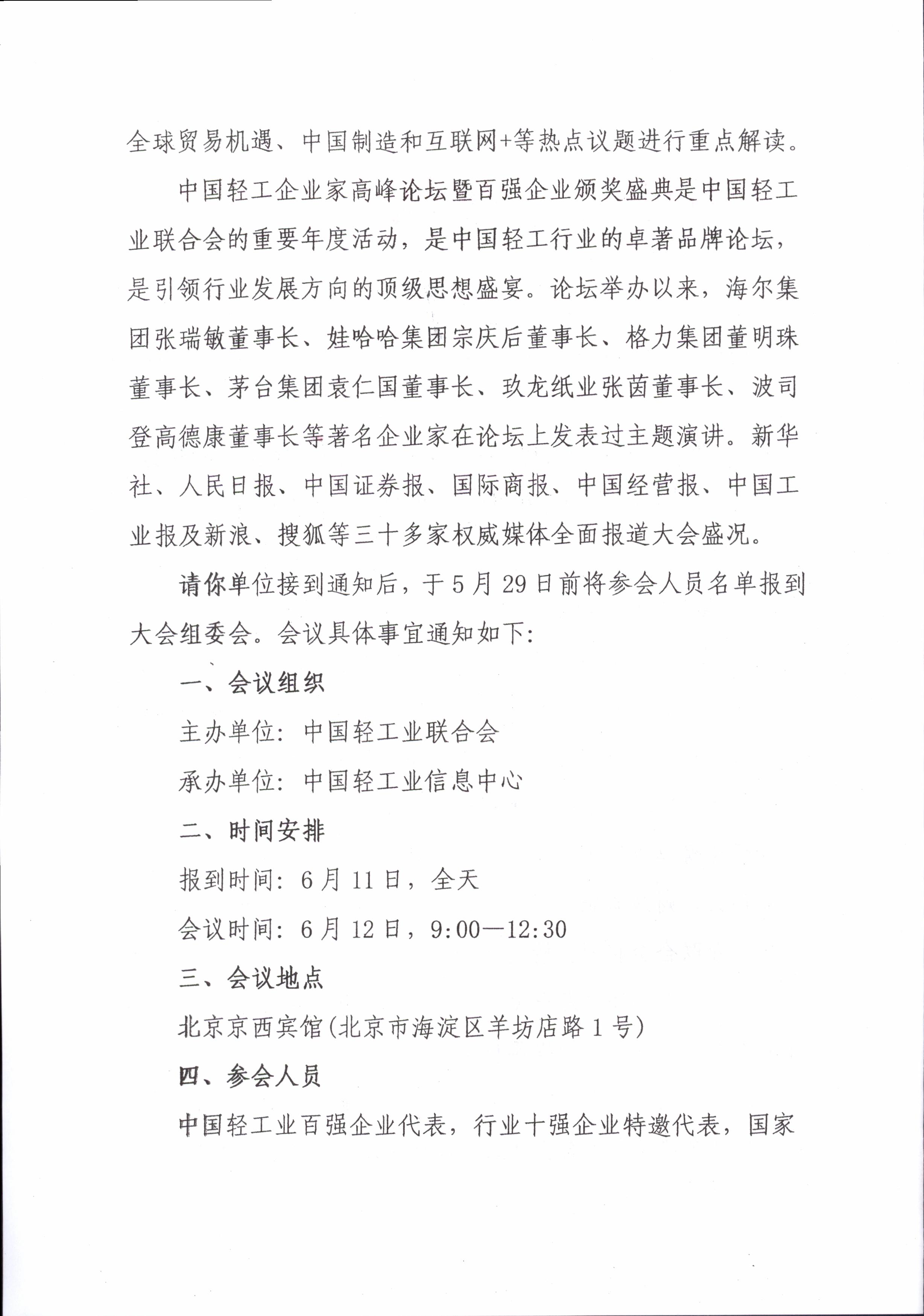 关于举办“第四届中国轻工企业家高峰论坛暨百强企业颁奖盛典”的通知