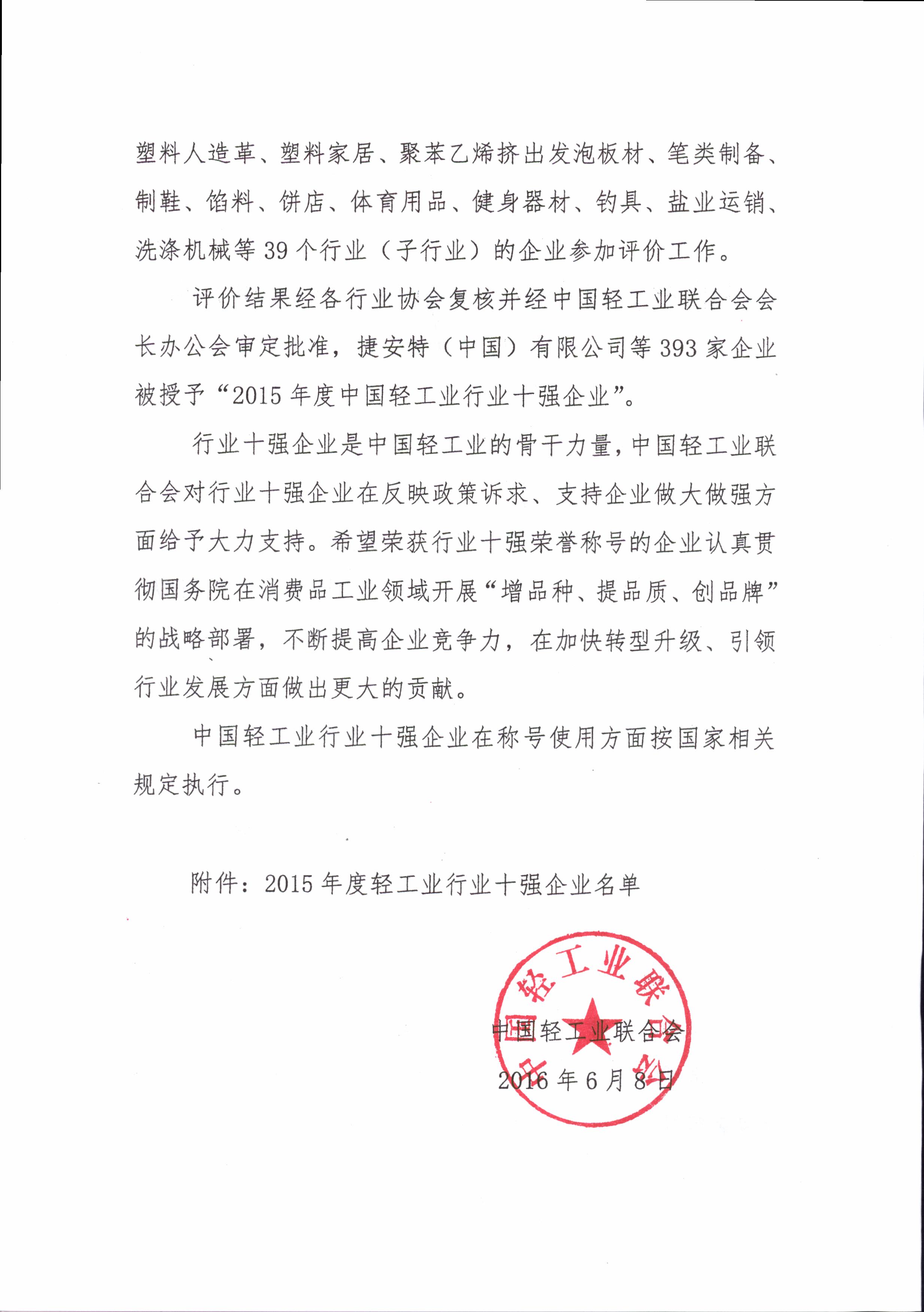 中国轻工业行业十强企业评价结果公告(2015年度)
