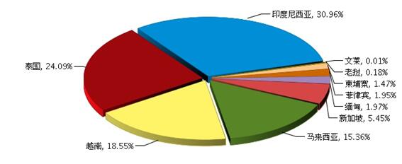 2016年1~6月全国轻工全行业对东盟累计进口额贸易国占比情况