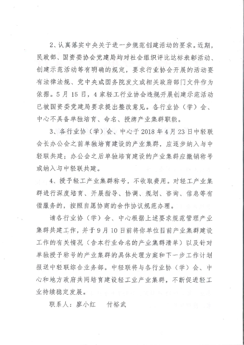 请各行业协(学)会、中心根据上述要求规范管理产业集群共建工作,并于9月10日前将你单位目前产业集群建设工作的有关情况(含本行业命名的产业集群清单)以及针对单独授予称号的产业集群的具体处理方案和下一步工作计划报送中轻联综合业务部。中轻联将与各行业协(学)会、中心和地方政府共同培育建设轻工业产业集群,不断促进轻工业持续稳定发展。