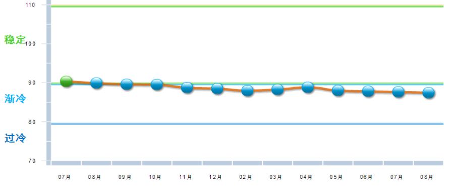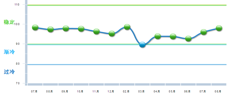 中国轻工业经济运行及预测预警系统数据显示:2018年开年,中轻景气指数延续去年四季度以来的下降态势,连续8个月在蓝色“趋冷”区间波动,6月以后呈现稳中缓升态势。8月中轻景气指数为88.39,环比7月上升0.15点,较去年同期下降1.99点。