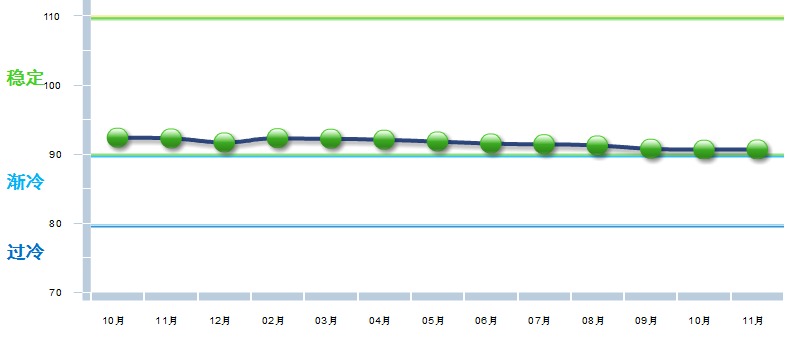中国轻工业经济运行及预测预警系统数据显示:2018年,中轻景气指数延续去年四季度以来的下降态势,连续11个月在蓝色“趋冷”区间波动,11月中轻景气指数为87.98,环比10月下降0.03点,较去年同期下降1.64点。