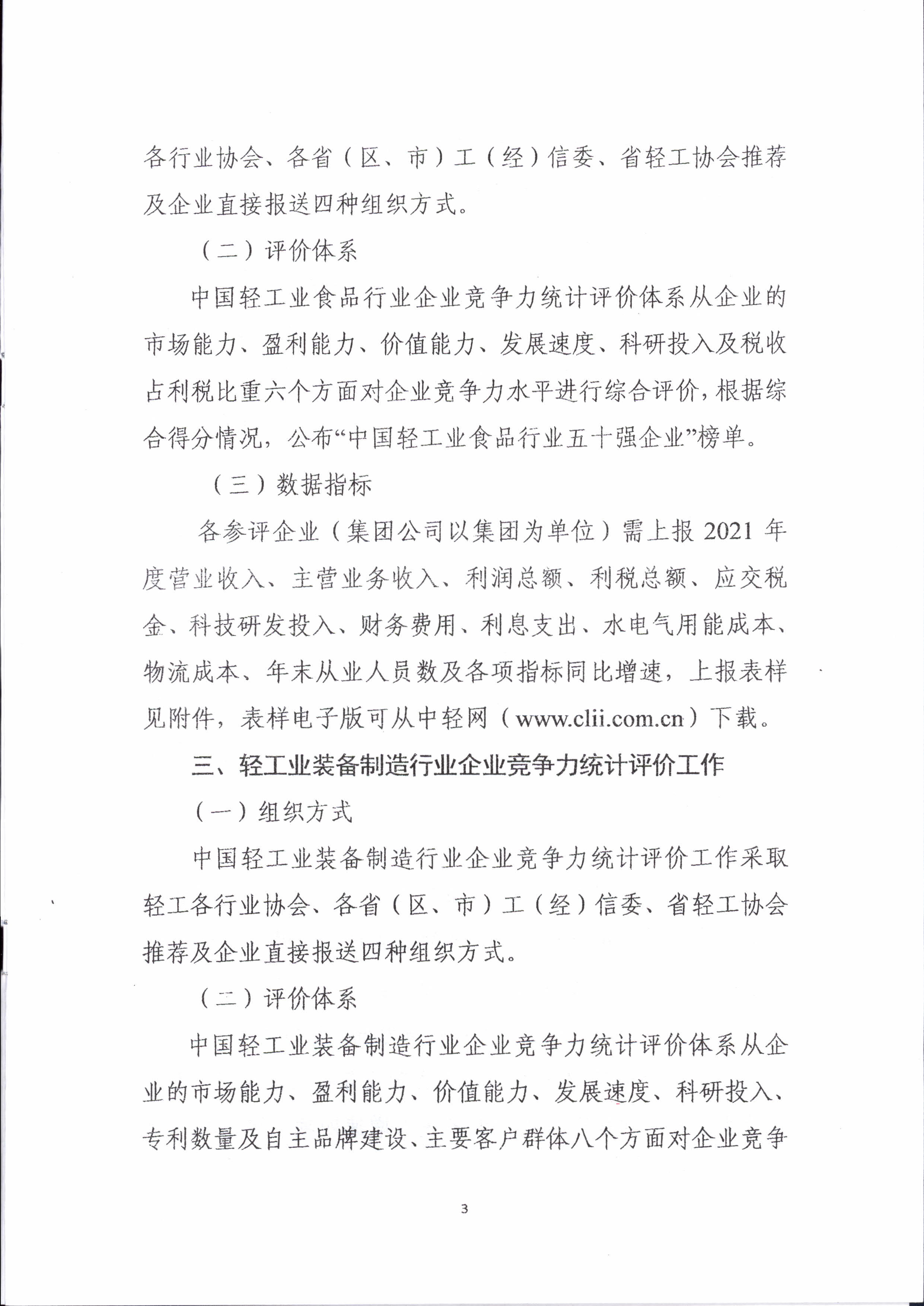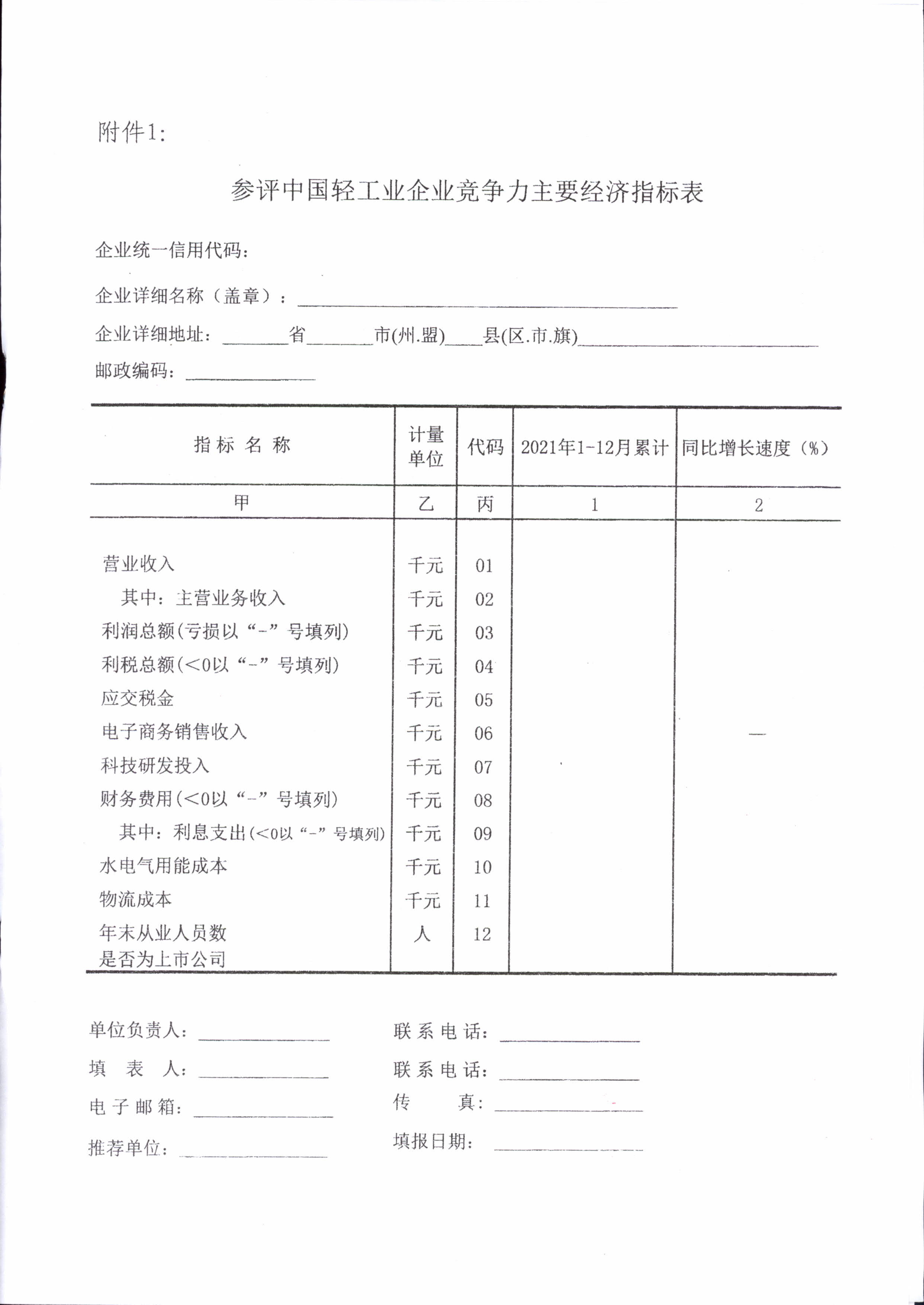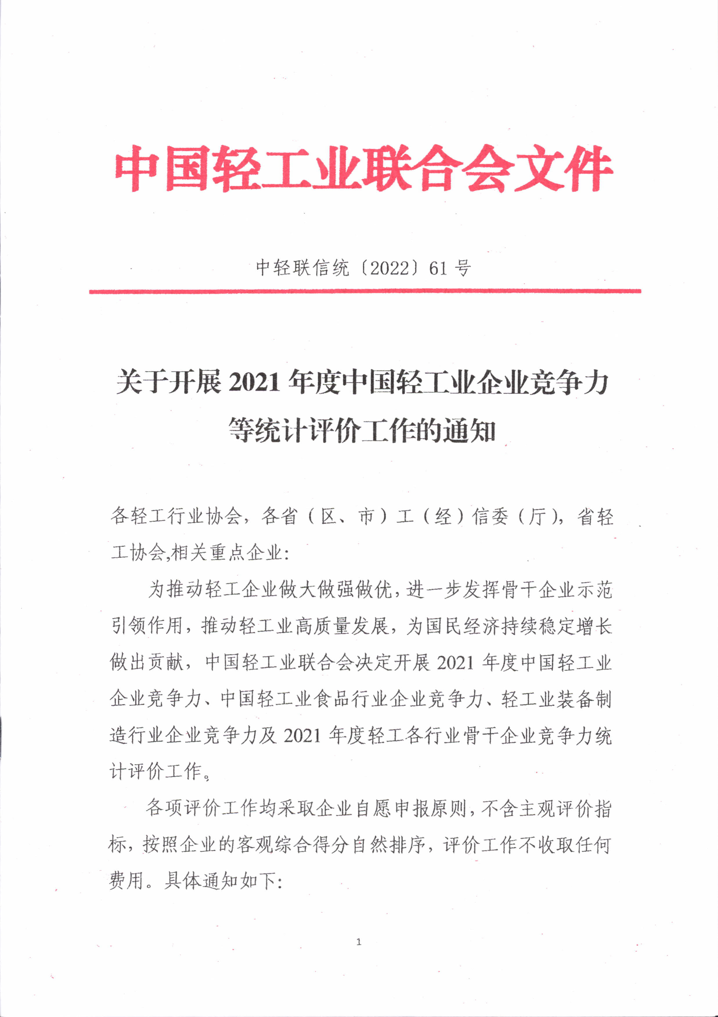 | 2、 | 关于开展2021年度中国轻工业企业竞争力等统计评价工作的通知 |