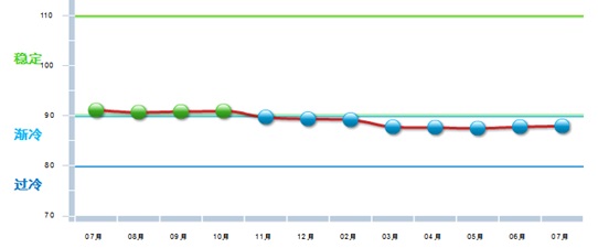 2015年7月中轻景气指数为87.91,较上月小幅回升0.14。中国轻工业经济运行及预测预警系统数据显示,近三年中轻景气指数呈现阶梯式下落走势。轻工月度景气指数已连续两年低于100,2014年该指数自年初以来在稳定区间底部徘徊。该指数自去年11月首次跌入渐冷区间以来,连续6个月逐月下降,6月开始止跌回升,本月继续小幅上升0.14点,反映轻工运行情况有所好转。