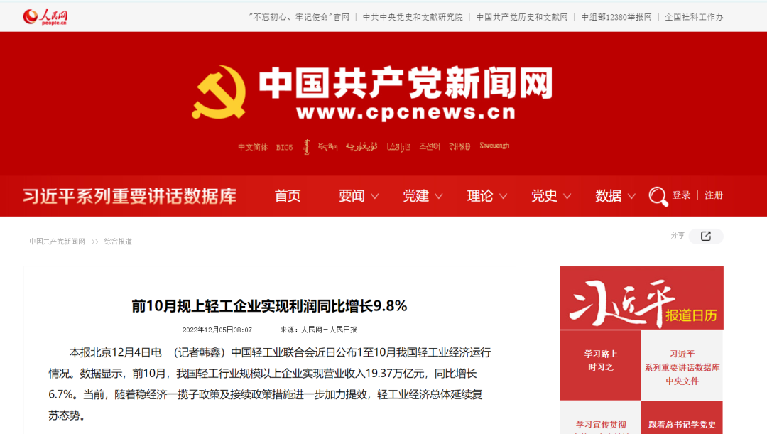 12月5日,《人民日报》要闻版以《前10月规上轻工企业实现利润同比增长9.8%》为题,深入报道今年前10月国内轻工持续恢复向好的经济运行态势。文章指出,前10月,我国 规模以上企业实现营业收入19.37万亿元,同比增长6.7%。