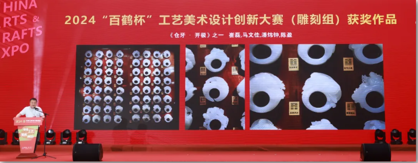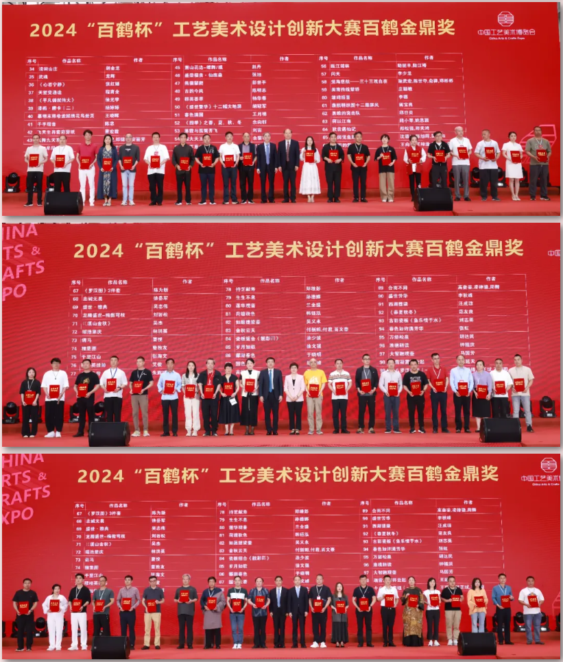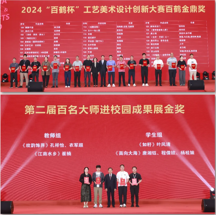 为贯彻落实习近平总书记关于传统手工艺振兴的重要指示批示精神,激励从业者奋发向上,推动传统工艺高质量传承发展,促进工艺美术行业繁荣发展,闭幕式上为在2024年“百鹤杯”工艺美术设计创新大赛(以下简称“百鹤杯”)、第二届百名大师进校园成果展、传统工艺大国非遗工匠等活动中涌现出的优秀作品、大师工匠举行了颁证仪式。