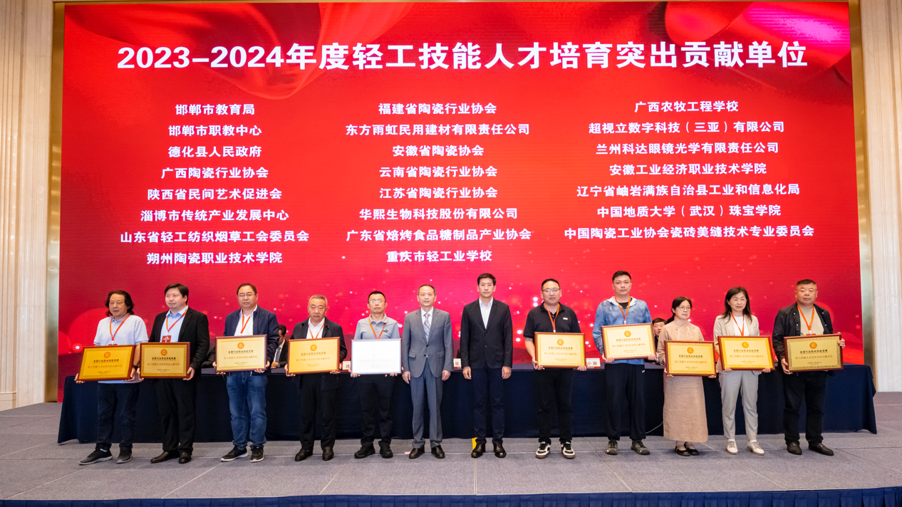 大会对获得2024年“全国轻工技术能手”荣誉称号的优秀选手进行表彰。大会授予中国陶瓷工业协会等5家单位“2024年全国行业职业技能竞赛轻工大赛优秀组织单位”荣誉称号,授予河北省总工会等17家单位“2024年全国行业职业技能竞赛轻工大赛突出单位”荣誉称号;授予邯郸市教育局等23家单位“2023—2024年度全国行业职业技能大赛轻工技能人才培育突出贡献单位”荣誉称号。大会还对全国行业技能竞赛轻工大赛优秀裁判员进行表彰。并为一批获奖代表授牌。