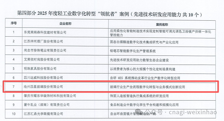 发布“2025年度轻工业数字化转型‘领航者’案例”,中国玻协理事单位河北明尚德玻璃科技股份有限公司与会员单位沧州四星玻璃股份有限公司入选,在此向两家单位表示衷心祝贺。