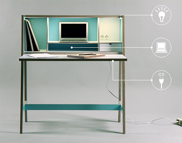 我们已经见到过很多节省空间的多功能家具,但这里还有一个更绝妙的设计,那就Laura Petraityt设计的Cabinet-desk。当关闭的时候,这个家具看起来并不激动人心,只是一个小小的存储块。翻转前门下来,您会看到一个功能完整的工作区隐藏在内阁。它是一个结构紧凑的桌子,使用方便,有着足够的存储,带有一个内置的LED灯,也有综合交流电源插座供您插入装置。关上了门,便给您一天的工作画上了句号。之后它会在您重新开始工作的时候转换为您的办公室,非常地便利。