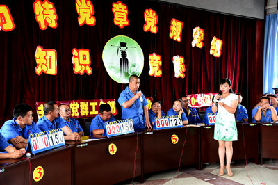 6月17日,在伊力特机关四楼会议室里,深红色的幕布上张贴着“伊力特党章党规党纪知识竞赛”标题,来自9个单位代表队的27名党员佩戴党徽身着蓝色厂服坐在台上,正紧张激烈答题。这是伊力特开展党章党规党纪知识竞赛一场景。