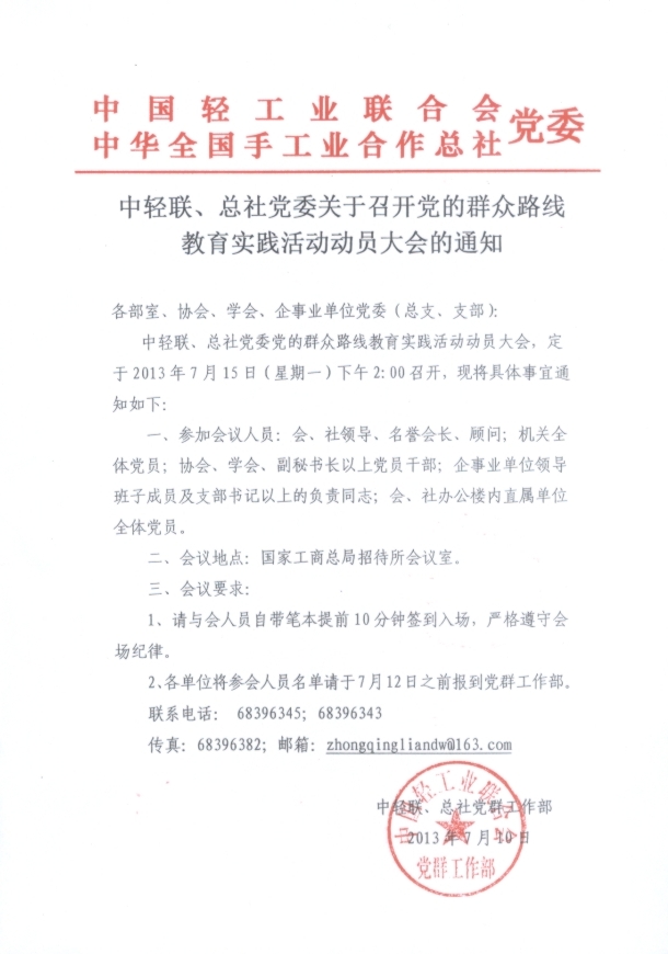 中轻联、总社党委关于召开党的群众路线教育实践活动动员大会的通知