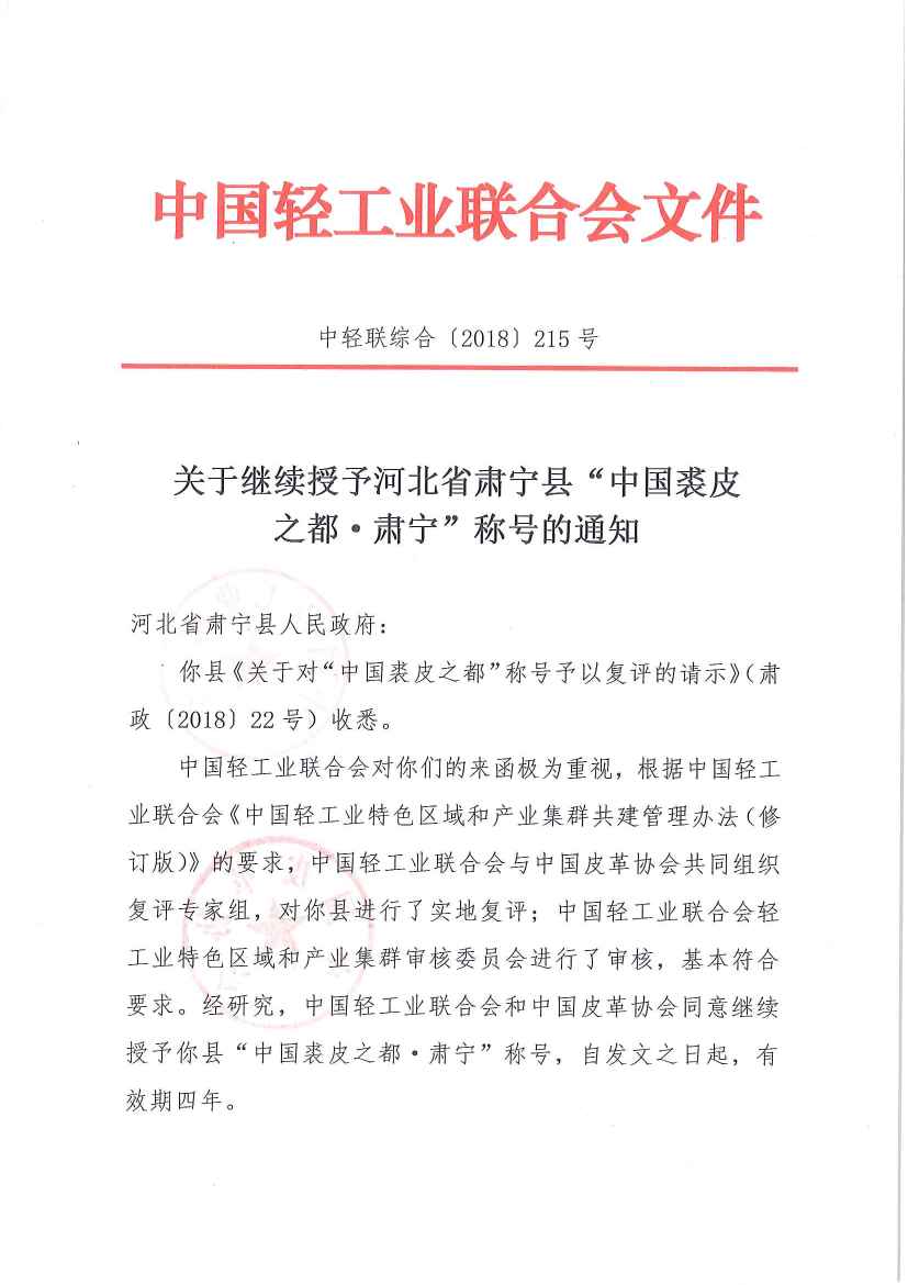 关于继续授予河北省肃宁县“中国裘皮之都•肃宁”称号的通知