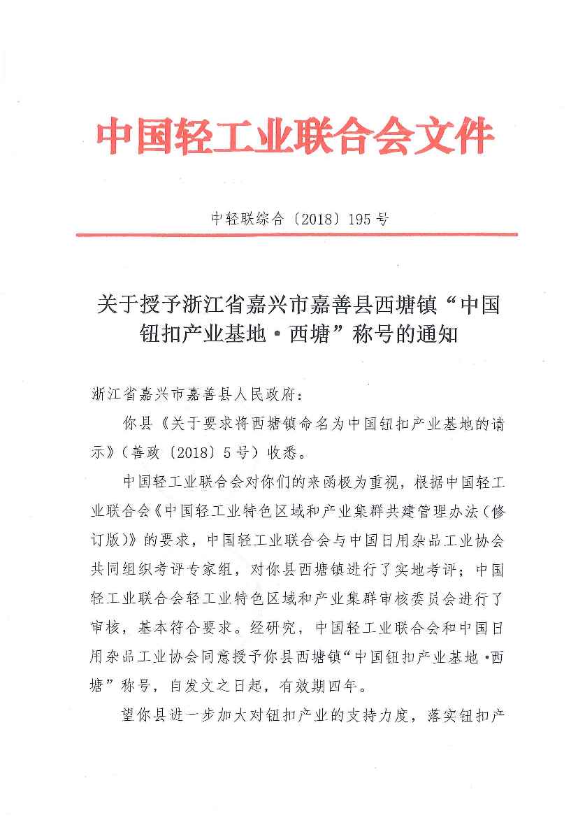 关于授予浙江省嘉兴市嘉善县西塘镇“中国钮扣产业基地•西塘”称号的通知