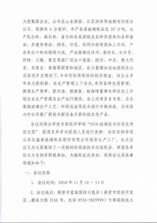 会议还将公布经专家组评审的“2018玻璃技术信息优秀论文奖” 获奖名单并对获奖人员进行表彰。会后安排参观山东长盛泰玻璃制品股份有限公司高密生产工厂, 这次会议又为大家提供了一次极好的现场技术交流机会。希望各单位大力支持并积极参加。为搞好此次活动,现将会议具体事项通知如下: