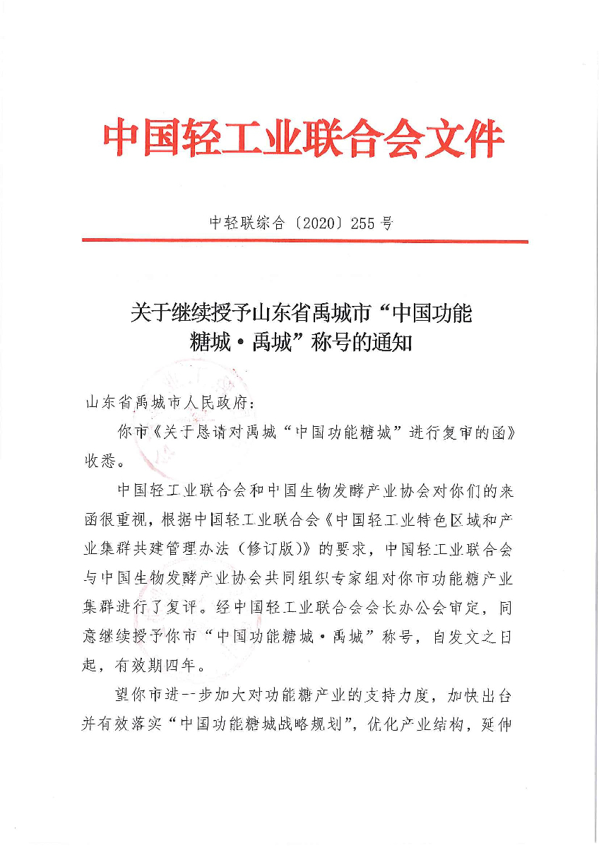 关于继续授予山东省禹城市“中国功能糖城·禹城”称号的通知