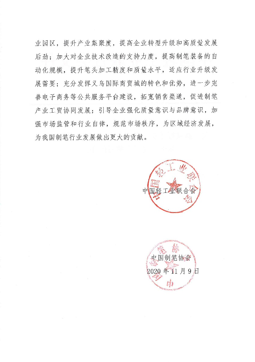 关于继续授予浙江省义乌市“中国制笔工贸基地·义乌”称号的通知
