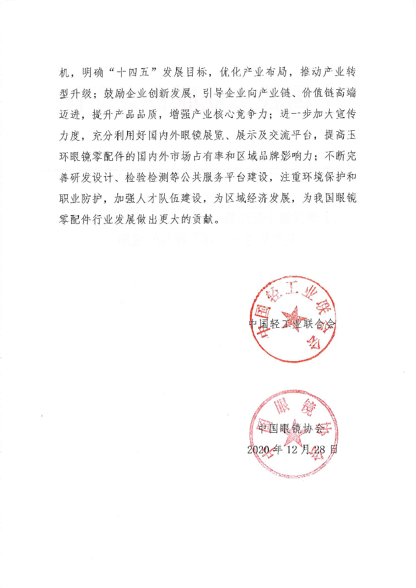 关于继续授予浙江省玉环市“中国眼镜零配件生产基地·玉环”称号的通知