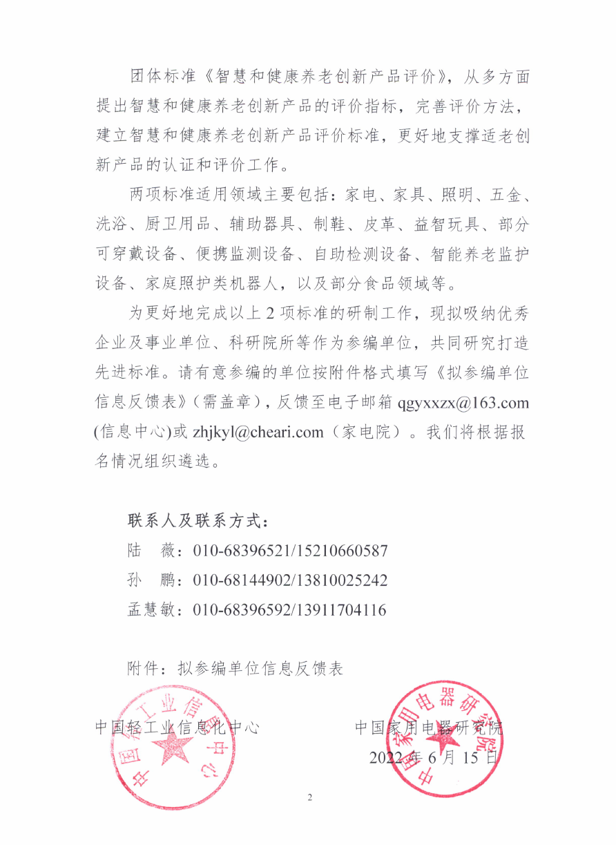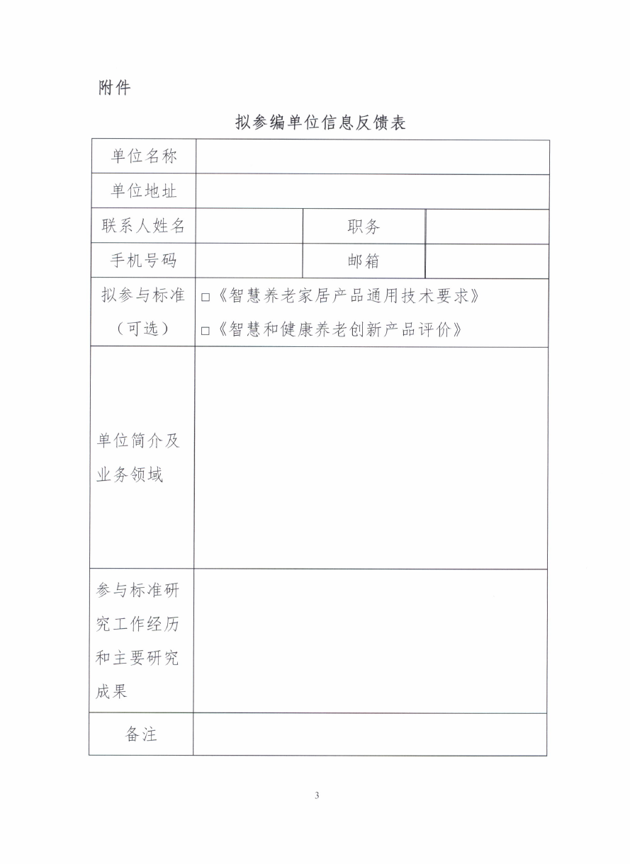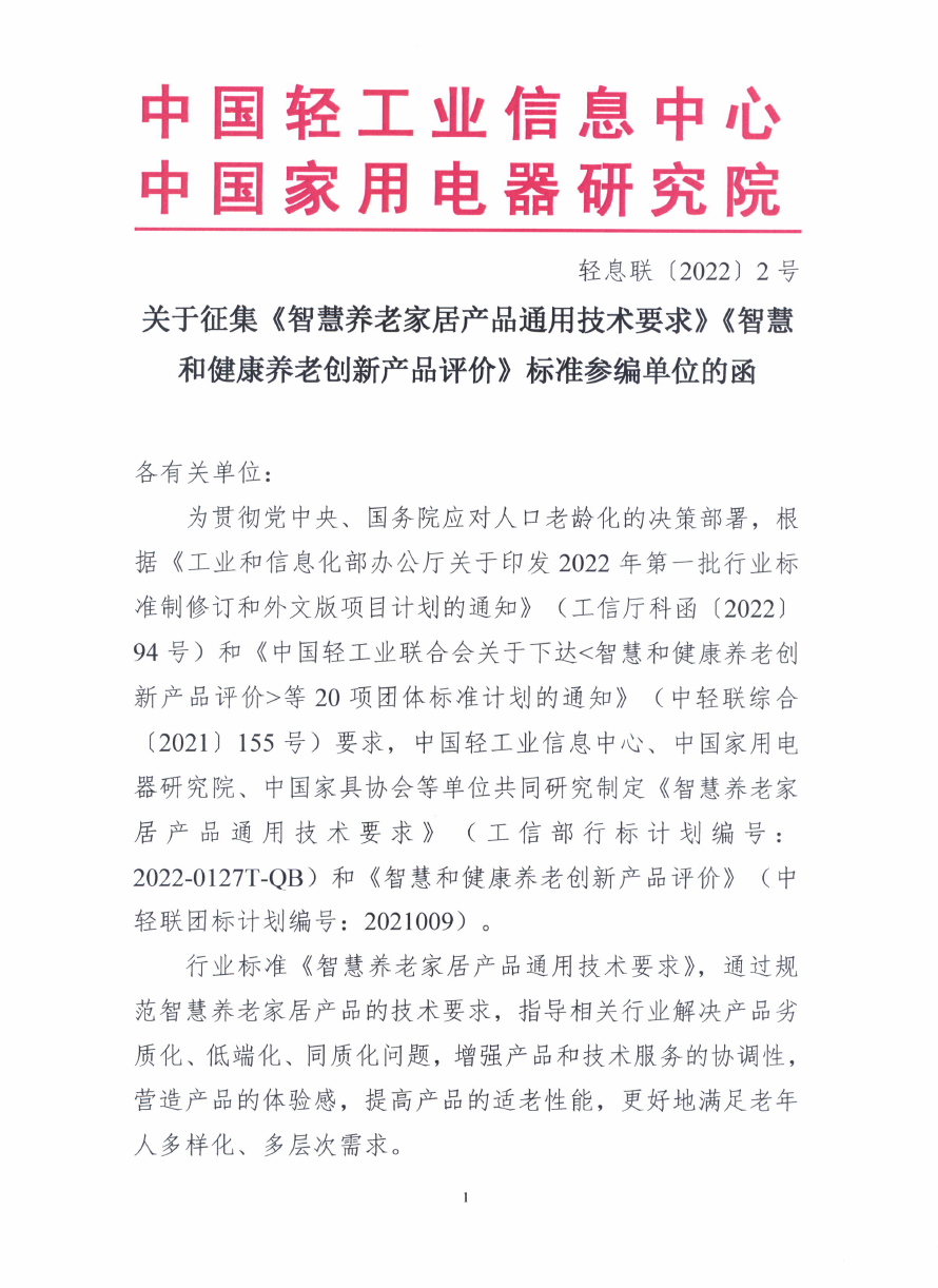 关于征集《智慧养老家居产品通用技术要求》《智慧和健康养老创新产品评价》标准参编单位的函