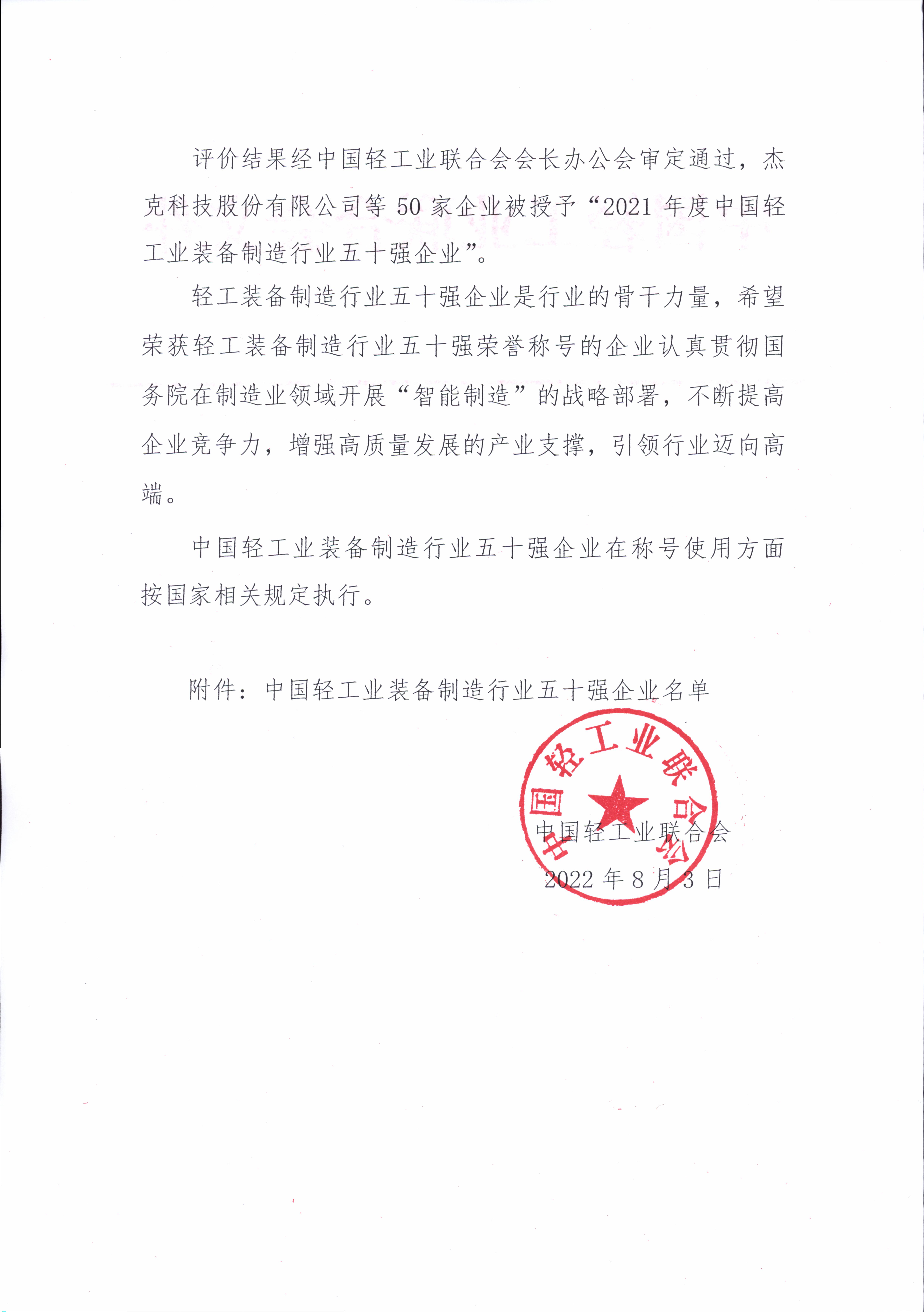 中国轻工业装备制造行业五十强企业评价结果公告(2021年度)