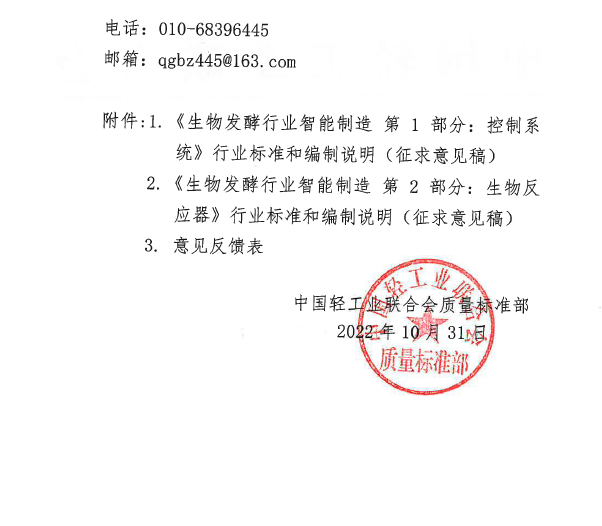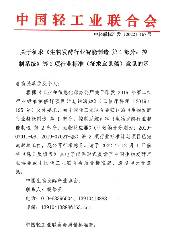 关于征求《生物发酵行业智能制造 第1部分:控制系统》等2项行业标准(征求意见稿)意见的函
