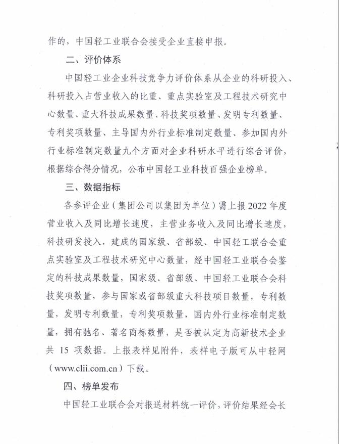 关于开展2022年度中国轻工业企业科技竞争力统计评价工作的通知
