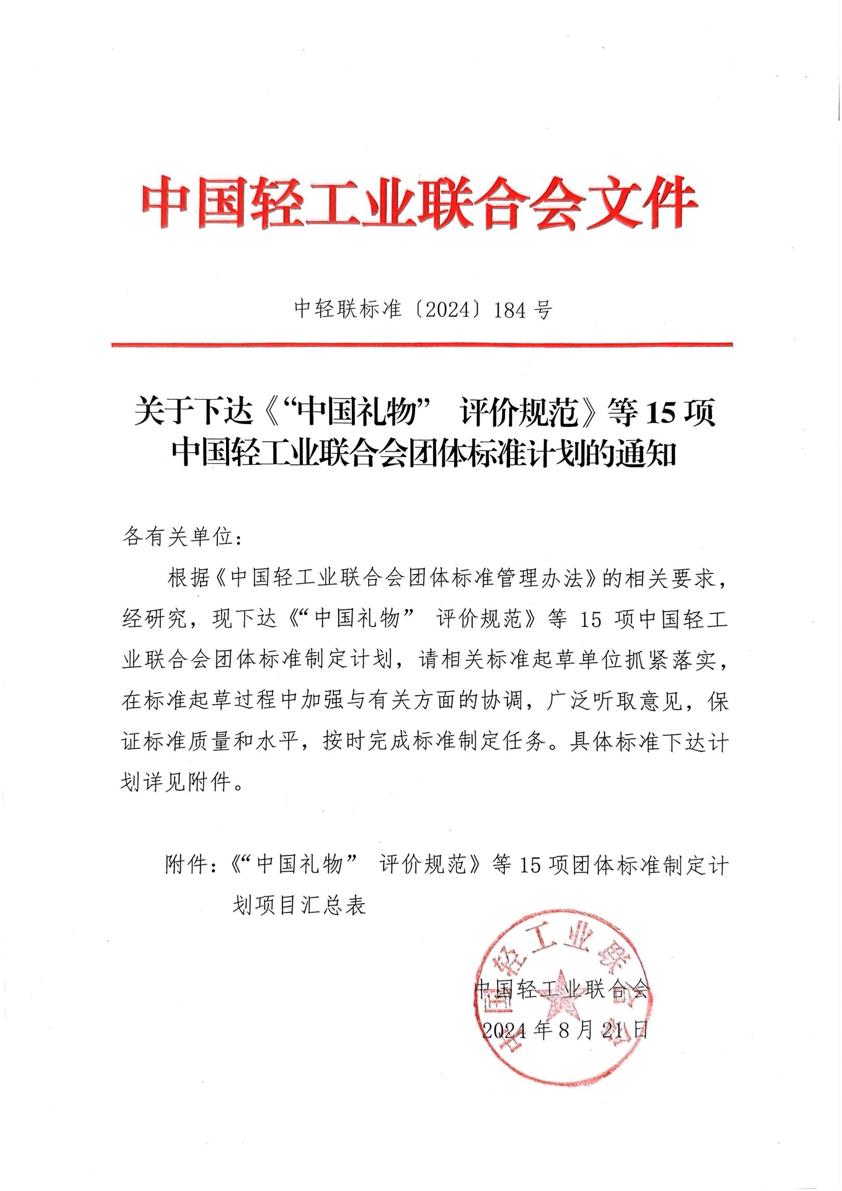 关于下达《“中国礼物”评价规范》等15项 团体标准计划的通知