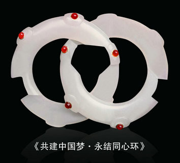 他创作的玉雕《共建中国梦,永结同心环》,作品为一块隐晶质石英玉,镶有玛瑙,可开可合,其内有二十四个截面,代表了二十四个节气和一年三百六十五天;外镶有十二颗玛瑙,代表了中国十二亿人民同心向上,共建中国的美好梦想。此作品既继承了宫廷传统工艺,又有雕刻者自身的创新,它响应了十八大“中国梦”的号召,是一件传统与现代完美结合的作品。此作品荣获2014年中国工艺美术精品博览会金奖和第九届“百花玉缘杯”中国玉石雕精品铜奖。