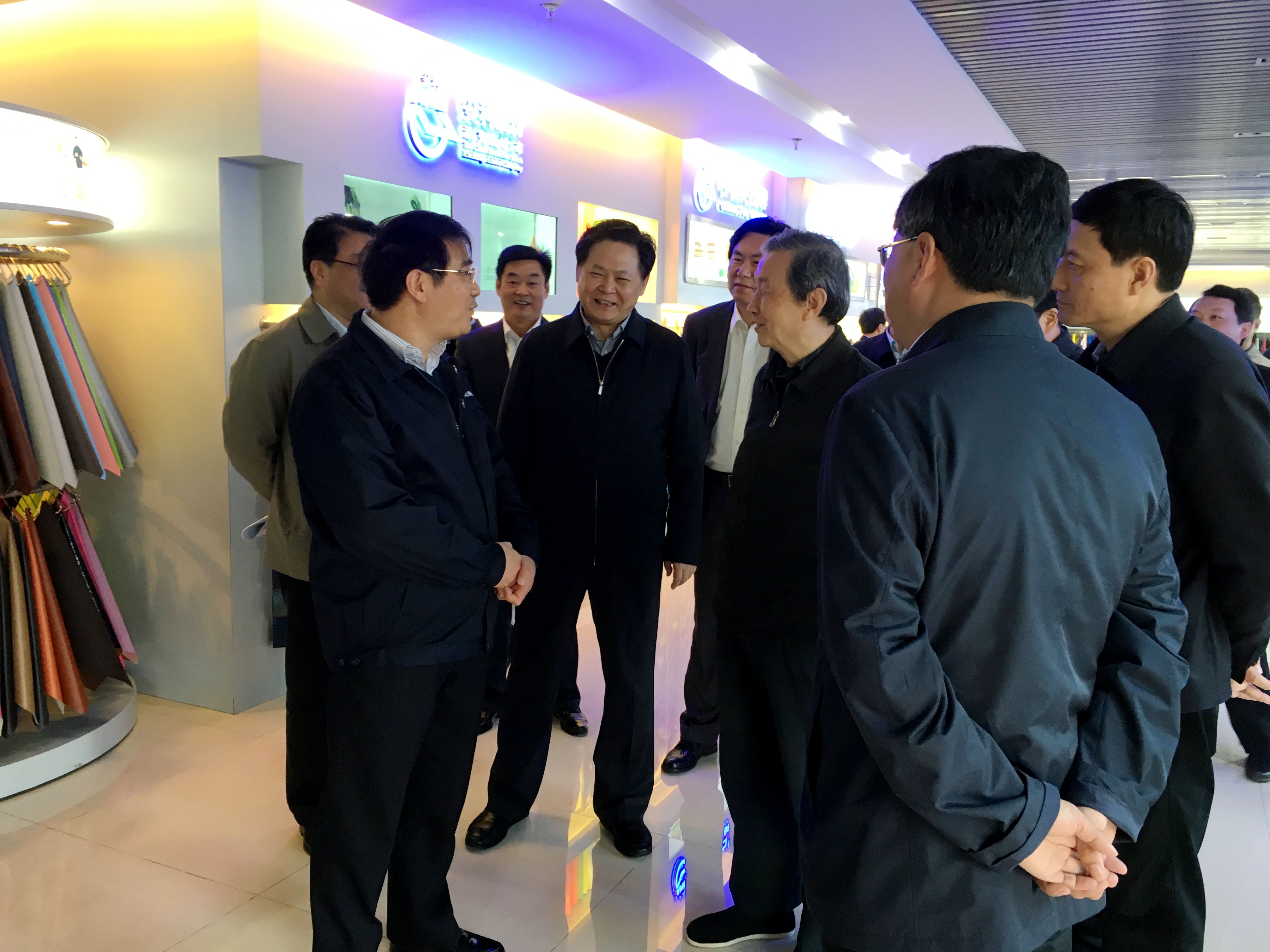 随后,马凯副总理一行进入安利股份研发楼中试线,当时,员工们正在紧张地忙碌着对无溶剂和水性聚氨酯合成革进行中试开发试制。交谈过程中,马凯副总理对生态绿色材料的研发十分关注,并仔细进行了询问。姚和平董事长介绍道,“安利坚持精益生产,不断提升自动化、信息化和智能化水平,积极推进清洁生产、绿色生产,工艺技术走在全球前列,尝到了智能制造和绿色发展的甜头”。安利股份副总经理王义峰、黄万里补充道,“无溶剂和水性聚氨酯合成革及聚氨酯复合材料,采用清洁化生产新技术,真正实现了节能减排和绿色环保”。马凯副总理点头赞许,他说,绿色发展需要绿色产品,企业要瞄准产业发展前沿,坚持开放创新、重点领域创新和市场导向创新,努力攻克核心关键技术,国家会从产业政策方面给予大力支持,助力企业创新发展、绿色发展。