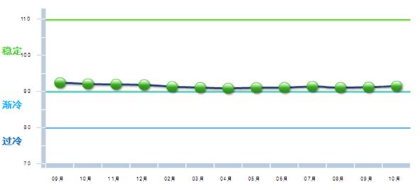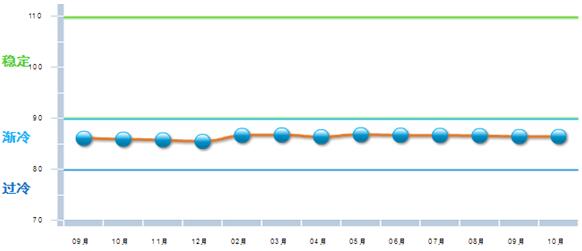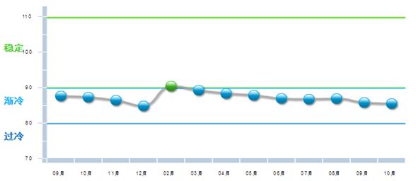 中国轻工业经济运行及预测预警系统数据显示:2016年10月份中轻景气指数为87.75,环比上升0.05点,仍处于蓝色渐冷区间。本年前10月该指数呈波动下行走势,10月较年初下降1.07点。
