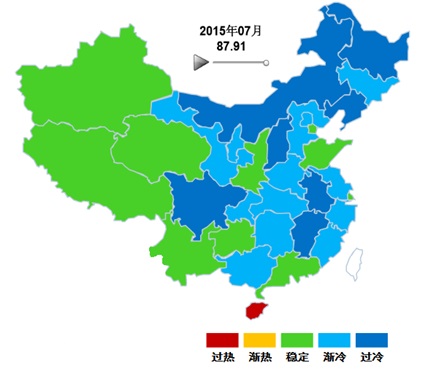 从分地区景气运行情况来看,在纳入监测的大陆地区31个省市自治区中,海南省处于“渐热”区间;新疆、西藏10省位于“稳定”区间,占32.3%;江苏、北京等13省位于“趋冷”区间,占41.9%;内蒙、安徽等7个省市位于 “过冷”区间,占22.6%。具体分布情况如下所示。