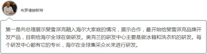 穿过研发中心厨房电器、洗衣机等产品的展示区域,斐雪派克首席执行官布罗德赫斯特告诉我们,当天首先向李克强总理介绍斐雪派克融入海尔集团大家庭的情况。