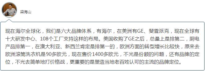 虽然海尔拥有斐雪派克100%的股份,但是在新西兰家电卖场内,仍然可以看到海尔、斐雪派克两个品牌,涵盖冰箱、洗衣机等家电,分别占据中高端、高端市场。数据显示,海尔和斐雪派克双品牌占据新西兰白色家电市场的43%,成为新西兰第一份额。梁海山表示,从创新研发到产品品牌,斐雪派克都有力地支持了海尔的全球化战略。去年,海尔在中国大陆之外的市场占到了整个全球销售额的一半。梁海山预计,今年海外销售额有可能超过中国大陆。