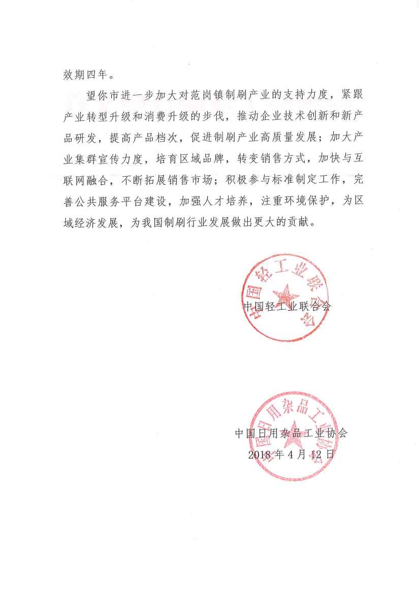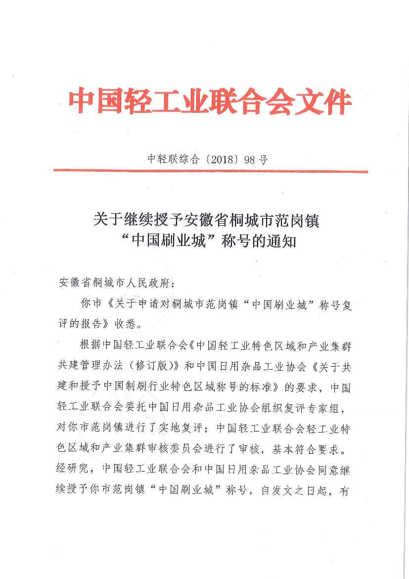 继续授予安徽桐城市范岗镇“中国刷业城”称号的通知