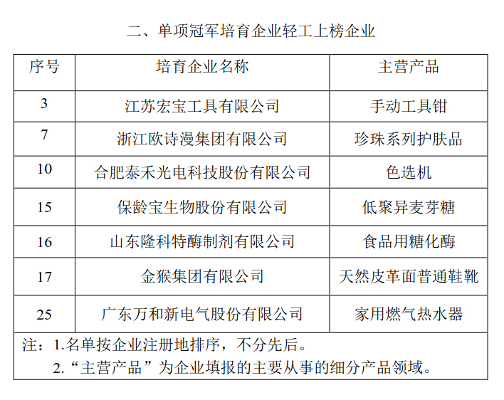 漳州立达信绿色照明集团有限公司、山东润德生物科技有限公司等9家轻工企业入选制造业“单项冠军示范企业”;浙江欧诗漫集团有限公司、保龄宝生物股份有限公司等7家轻工企业入选制造业“单项冠军培育企业”;贝发集团股份有限公司等轻工企业生产的“圆珠笔”、“食用木糖醇”等6个产品入选制造业“单项冠军产品”。