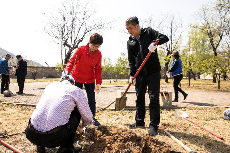 动员会后,张崇和等领导扛起铁锹、拿起镐头,和广大干部职工一起扶苗围堰、拎桶浇水,栽下了一株株车厘子、侧柏,为春日的北京增添了一片新的生机。随后,各位领导还和干部职工一起,对400余株树木进行了绿化养护。