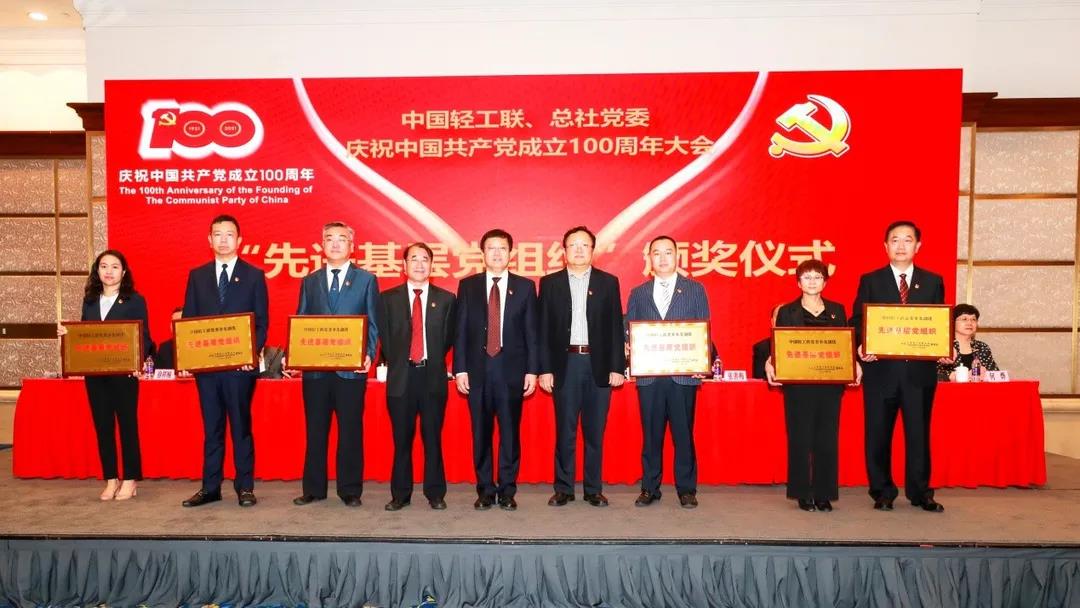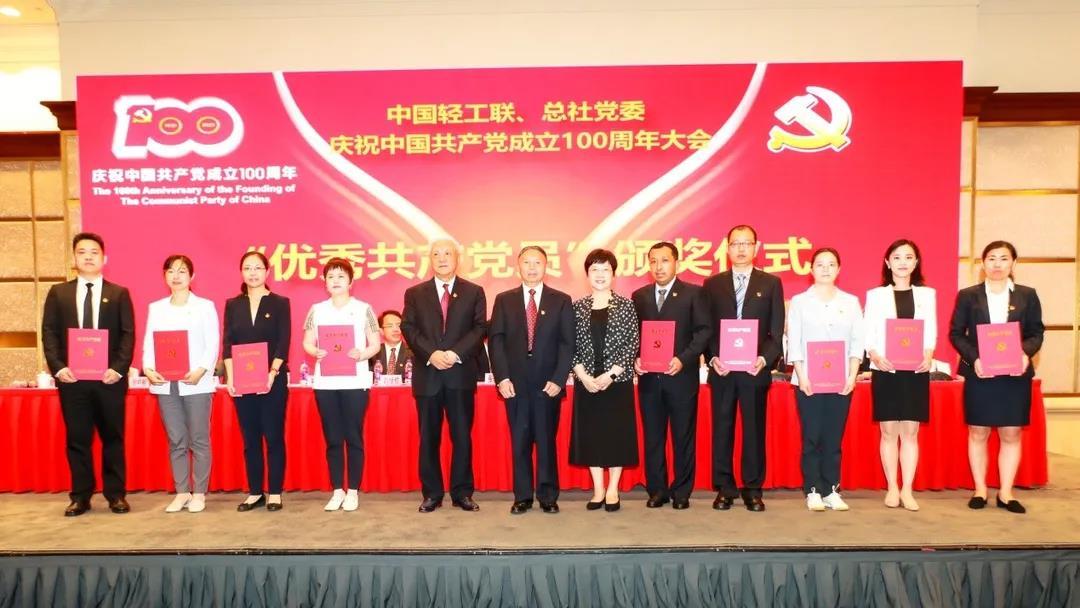 在全国上下喜迎建党百年的历史时刻,在全党深入开展党史学习教育的重要节点,6月29日,中国轻工联、总社党委在京召开庆祝中国共产党成立100周年大会,重温党的历史,总结“两化”经验,表彰先进典型,为“光荣在党50年”的老党员颁发纪念章,为新党员举行入党宣誓仪式。