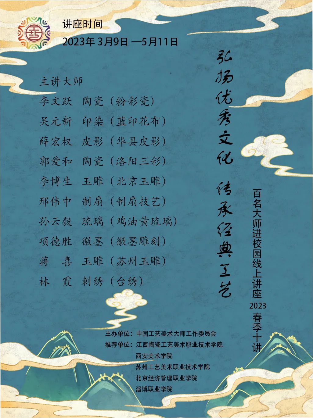 今年,大师委将继续开展百名大师进校园系列讲座活动。本次活动分春季、秋季两期,线下、线上同期进行。3月9日,春季线上讲座将正式开讲。本季讲座邀请到李文跃等十位中国工艺美术大师,以“弘扬优秀传统 传承经典工艺”为主题,分享包括陶瓷、印染、皮影等八个工艺品类,洛阳三彩、北京玉雕等十个小类的历史发展传承脉络和创新设计思路。本季讲座得到江西陶瓷工艺美术职业技术学院、西安美术学院(工艺美术系)、苏州工艺美术职业技术学院、北京经济管理职业学院、淄博职业学院基地院校的积极支持。