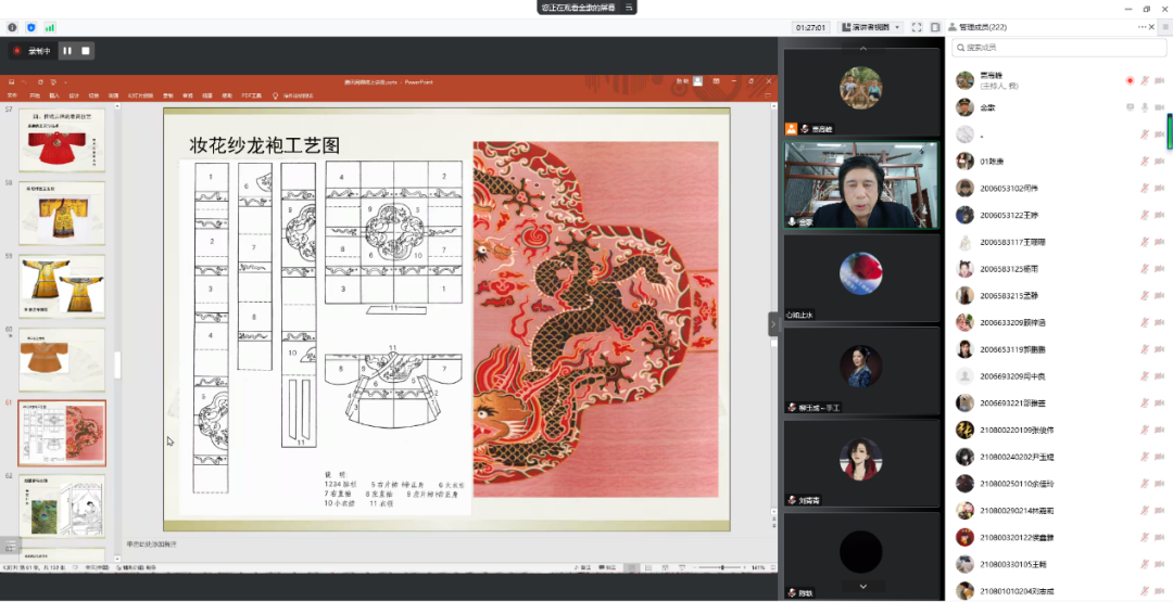 2022年10月-12月,大师委邀请杨青等八位中国工艺美术大师,以“创新研发 跨界融合”为主题,开办了八次线上讲座,共有4000余人听取了讲座。线上讲座内容丰富,形式多样,主讲大师或言传身教,讲述学艺成长的艰辛之路;或引经据典,深刻阐释传统工艺时代内涵;或分享心得,传授经典之作的创作思路;或剖析案例,探讨工艺美术创新设计、创意研发路径;或展示实操,传授传统工艺制作流程和技法。大师系列讲座受到广大师生和手工艺爱好者的广泛好评。