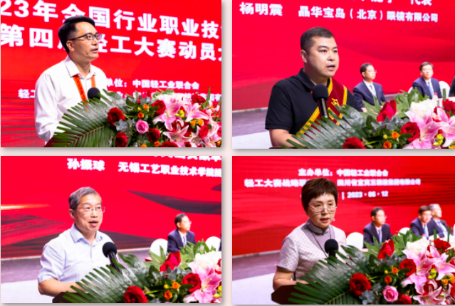 “全国五一劳动奖章”获得者代表、广州市工贸技师学院教师陈泽群,“全国轻工技术能手”代表、晶华宝岛(北京)眼镜有限公司经理杨明震,轻工人才培育突出贡献单位代表、无锡工艺职业技术学院院长孙振球,轻工大赛优秀裁判员代表、中国工艺美术大师傅长敏先后进行交流发言。