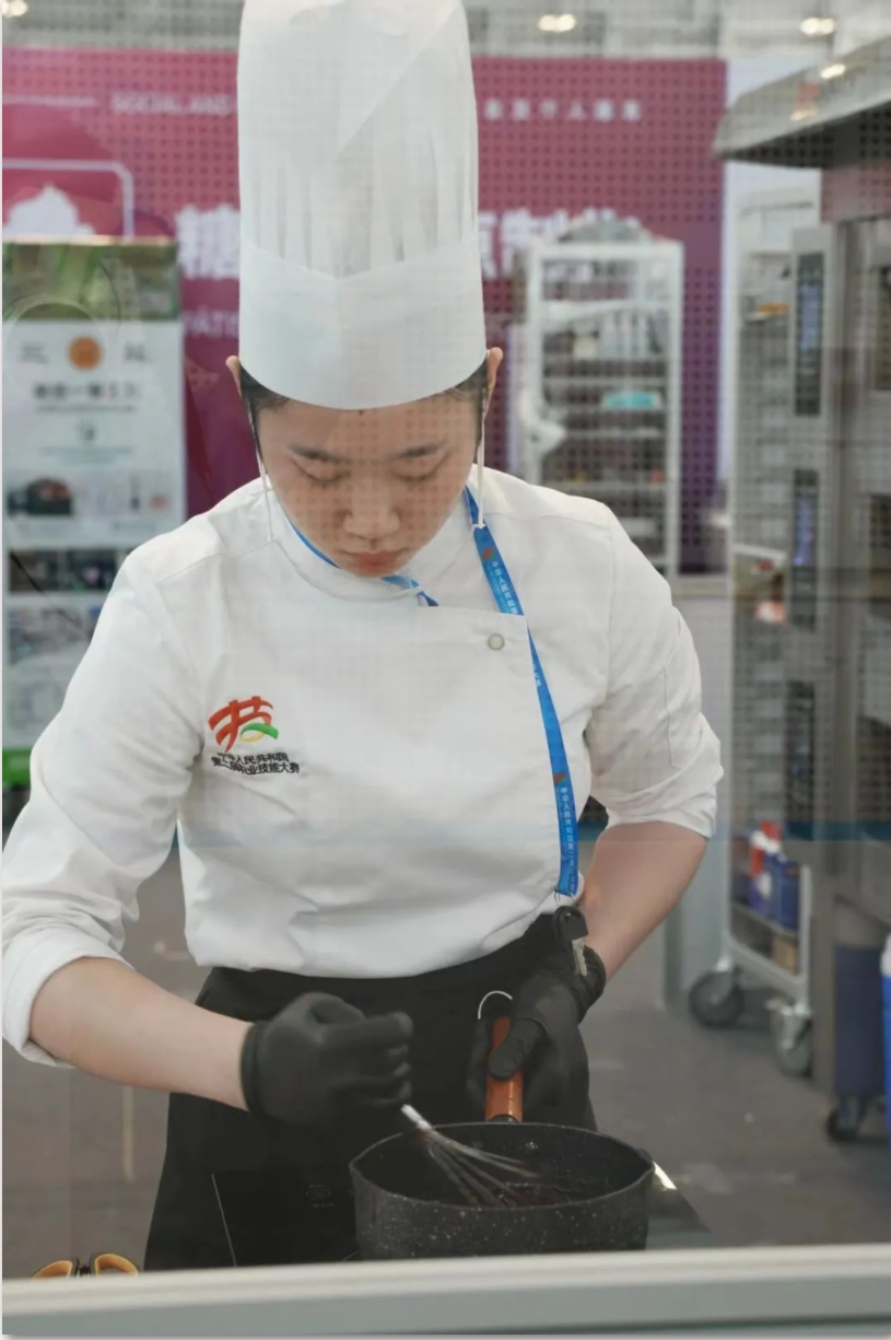 图为轻工代表队选手徐钰淇在参加糖艺/西点制作项目世赛选拔。该赛项考察选手理解食材色彩搭配、口味组合和质地协调的能力,考察用不同材料制作糖果糕点并进行装裱的能力。