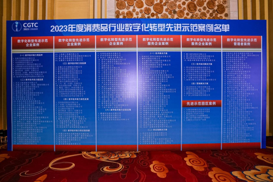 大会发布了2023年度消费品行业数字化转型先进示范案例218个,其中数字化转型先进示范企业案例110个,数字化转型先进示范服务企业案例57个,数字化转型先进示范管理者案例45个,数字化转型先进示范园区案例6个。