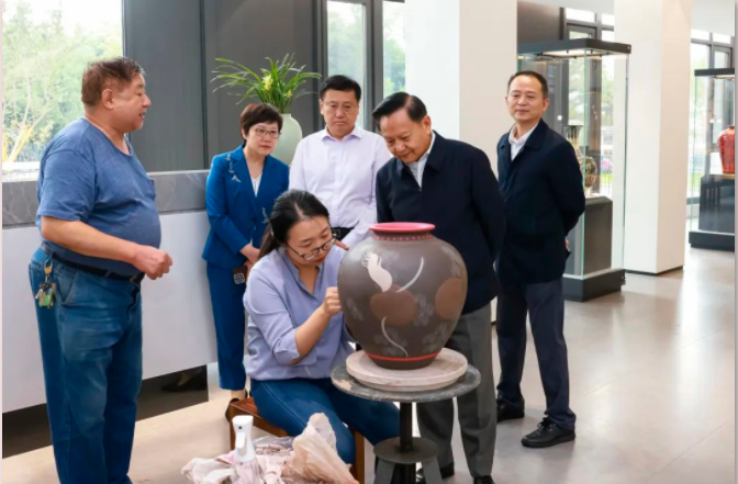 在宜期间,张崇和等领导前往中国工艺美术大师吕俊杰、华健、李守才、毛国强、吴鸣、王潇笠等工作室考察调研。了解大师传承技艺、传道受业情况。鼓励大师积极构建创作创新、带徒授艺、技艺交流、教育实训、展示成果的平台,为工艺美术传承创新做出新的更大的贡献。