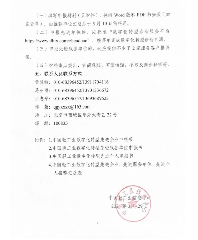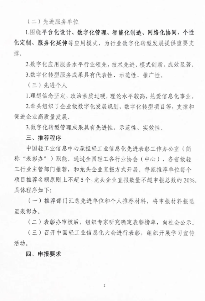 本次评选表彰工作申报阶段拟于5月中旬左右结束,主要通过国家级 组织、省级 主管部门推荐、重点单位直接报送方式申报评选。最终将评出轻工业数字化转型先进企业100家、先进服务机构(公共服务平台)30家、先进个人70名。
